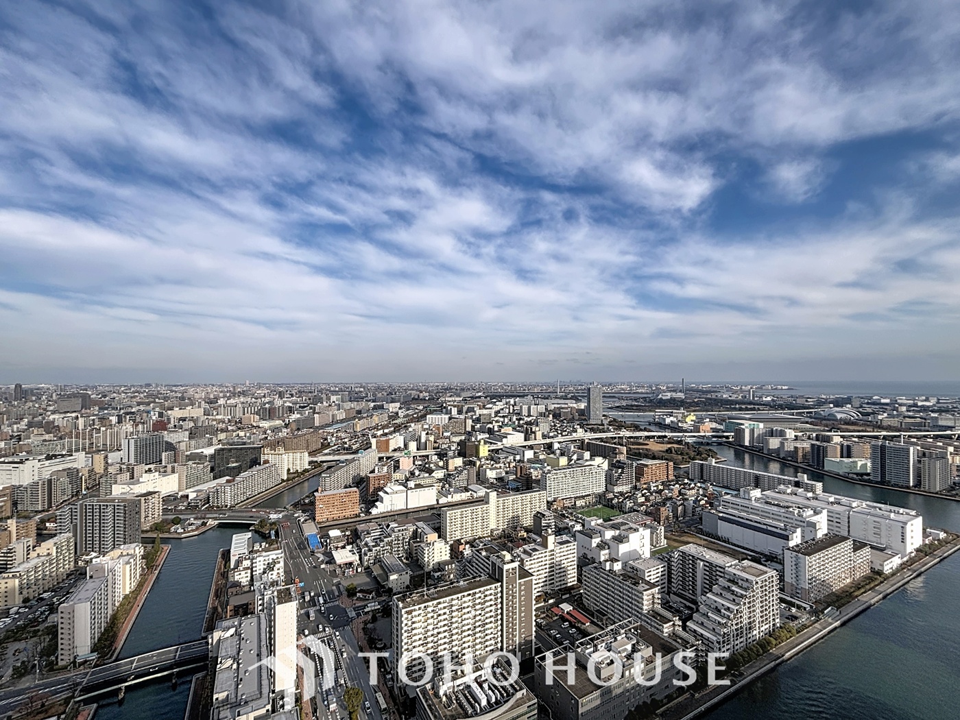 豊洲駅から歩いて5分。運河の潤いを感じる街にそびえる、大規模ツインタワー。その44階に位置するこの部屋は、遮るもののない広大な空を独り占めできる特等席です。