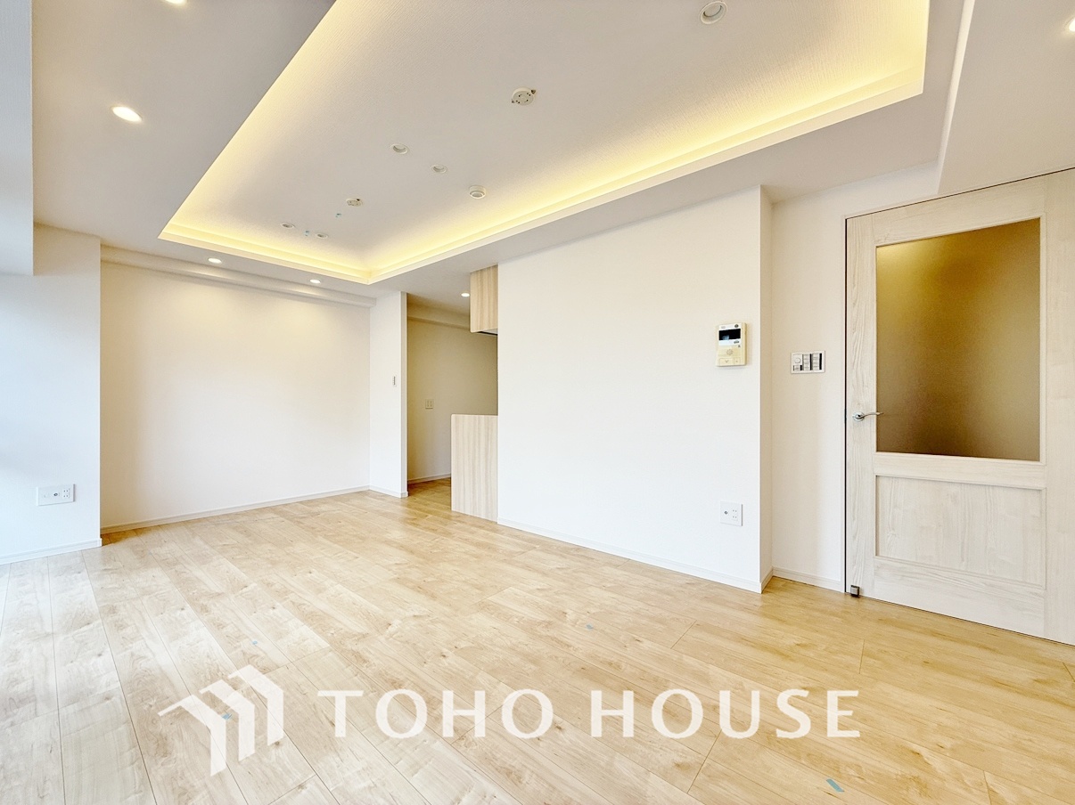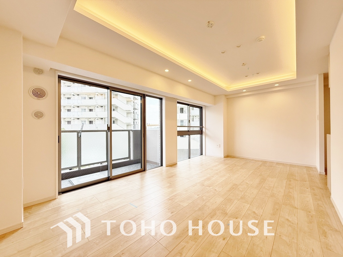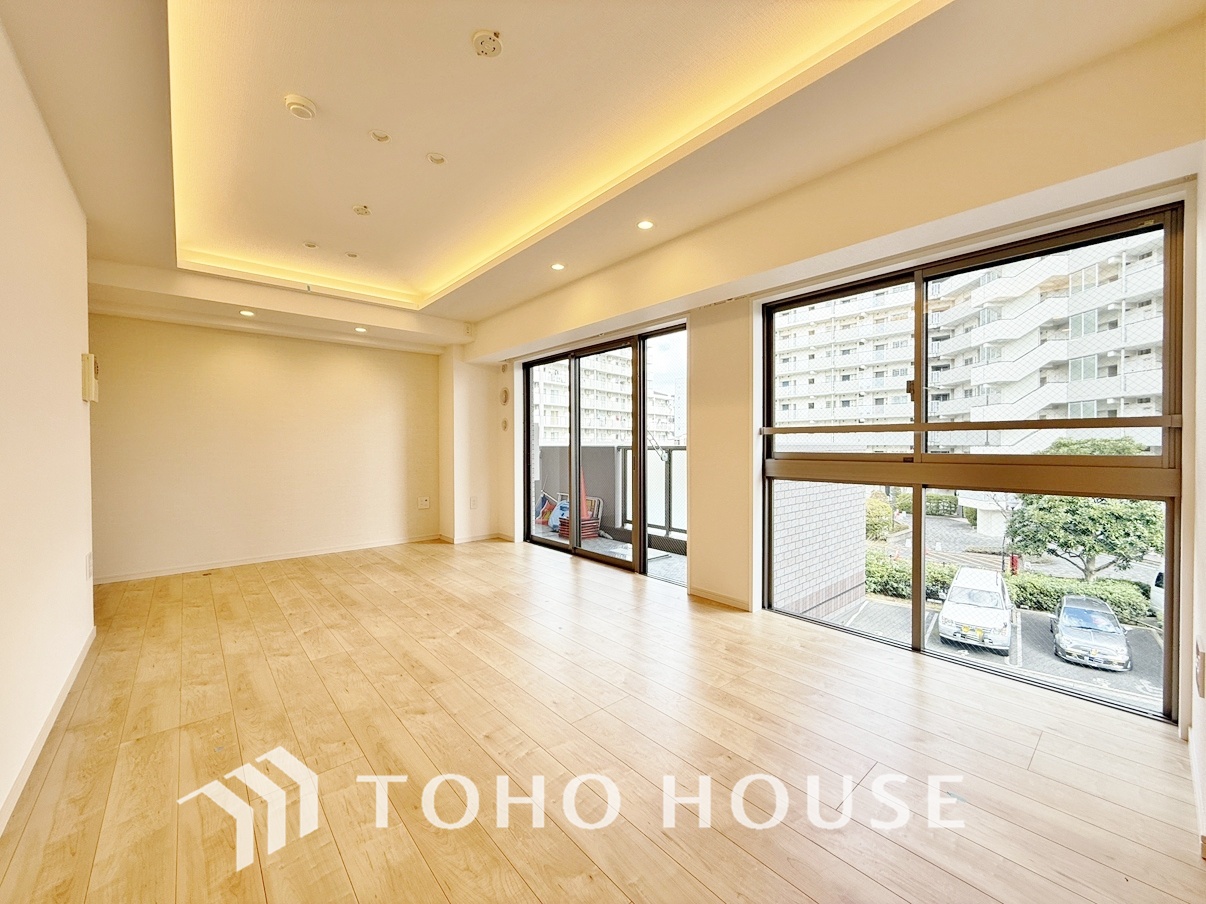 南東からの陽光が優しく差し込む明るいリビングルーム。ペットの足音も心地よく響く、ご家族の温もりが自然と集まる広々とした空間です。