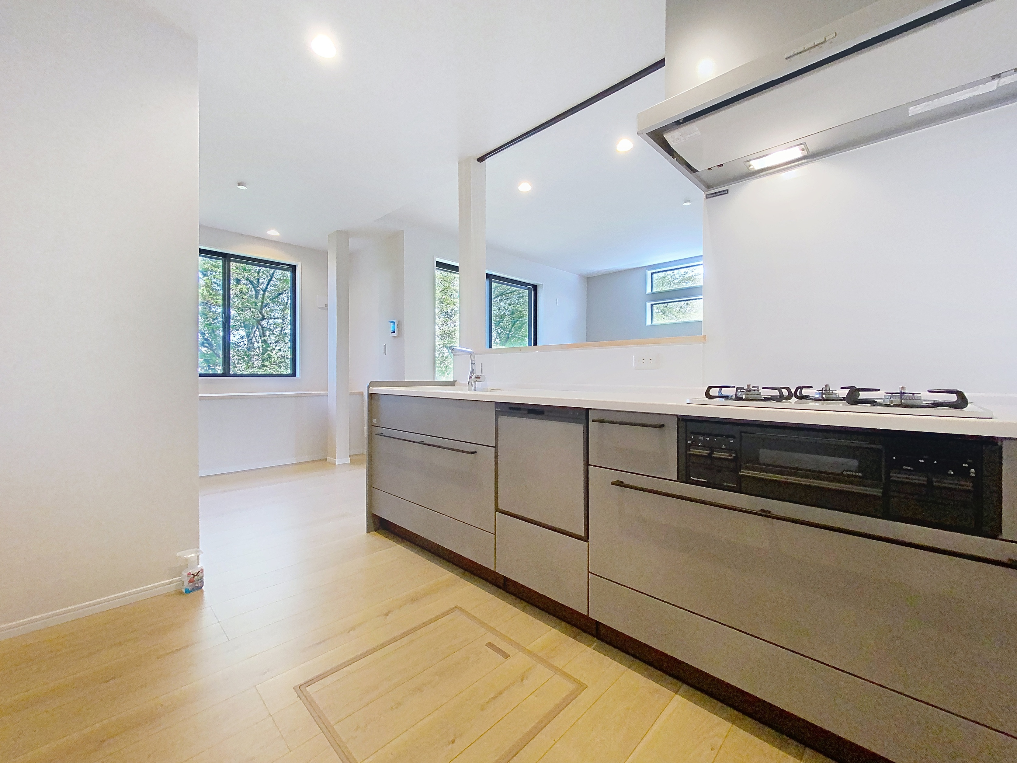 システムキッチンからリビング全体、そしてその先の緑まで見渡せる開放的な間取りは、ゲストを招いても窮屈さを感じさせない素晴らしい空間ですから。