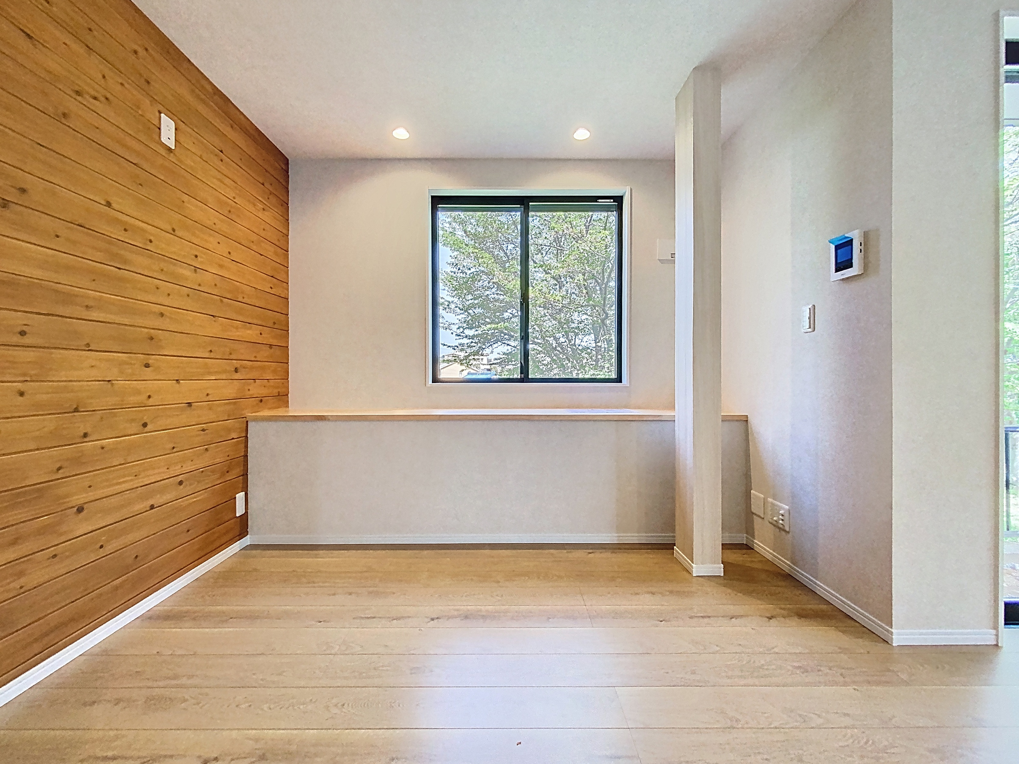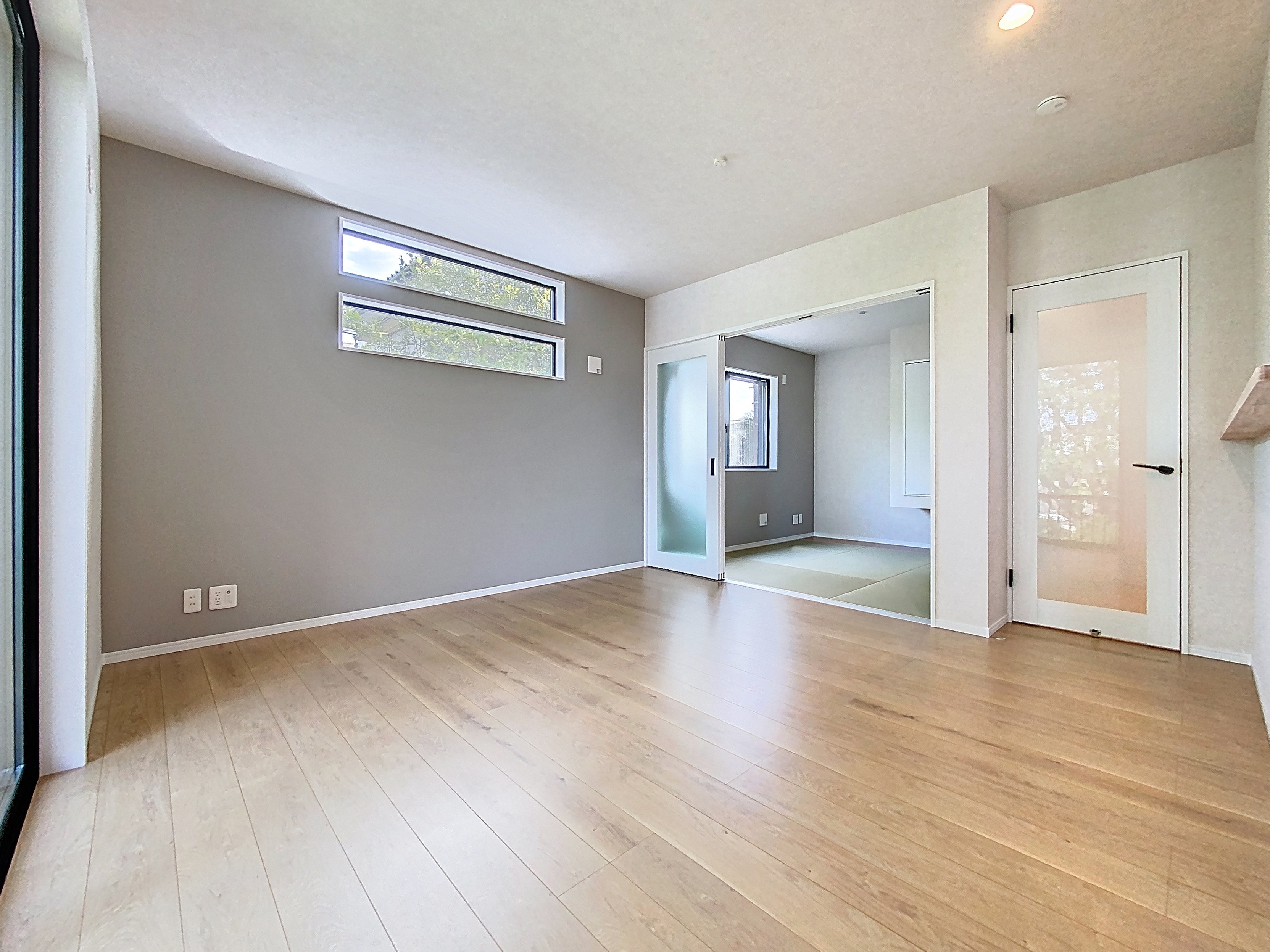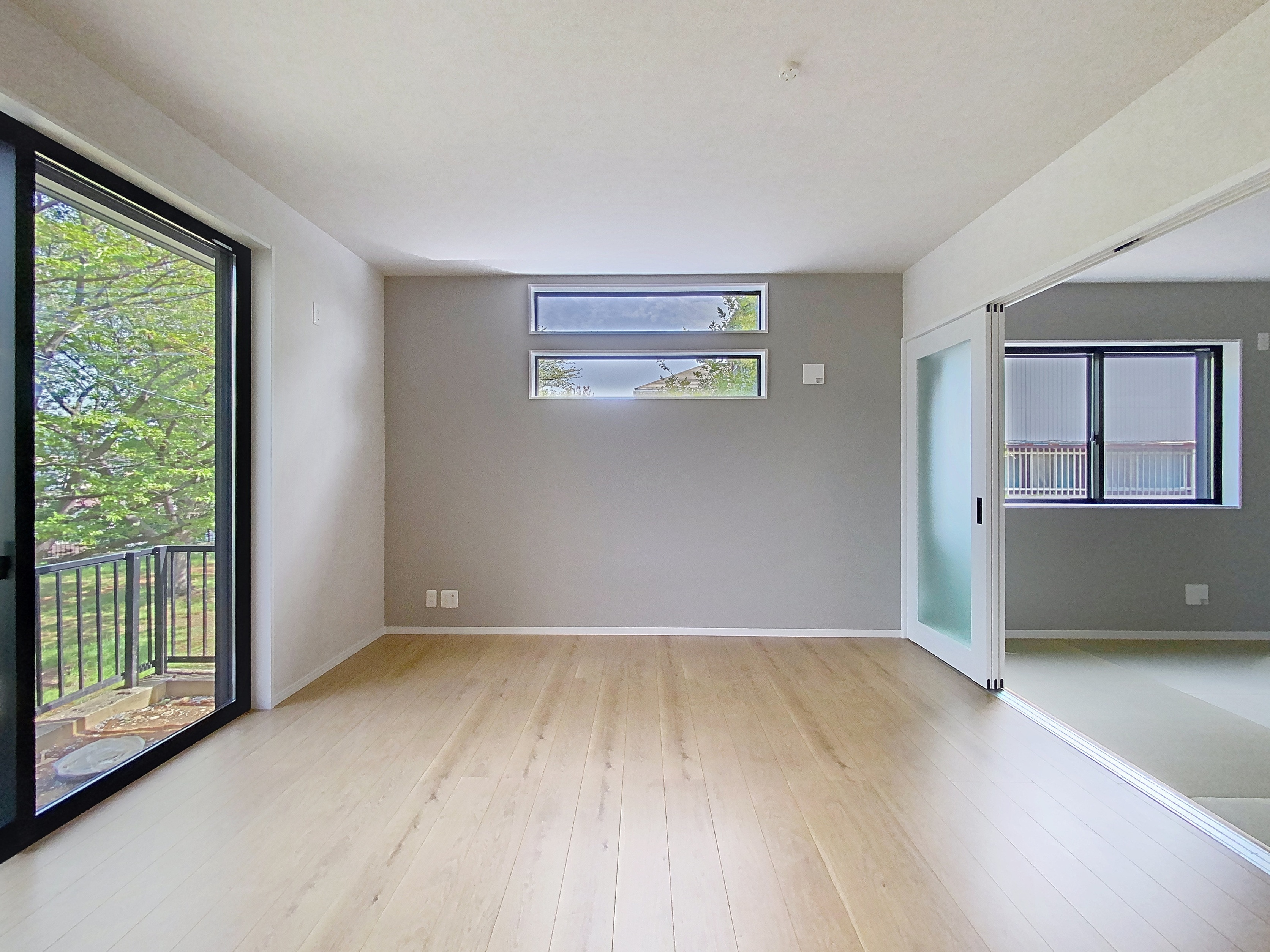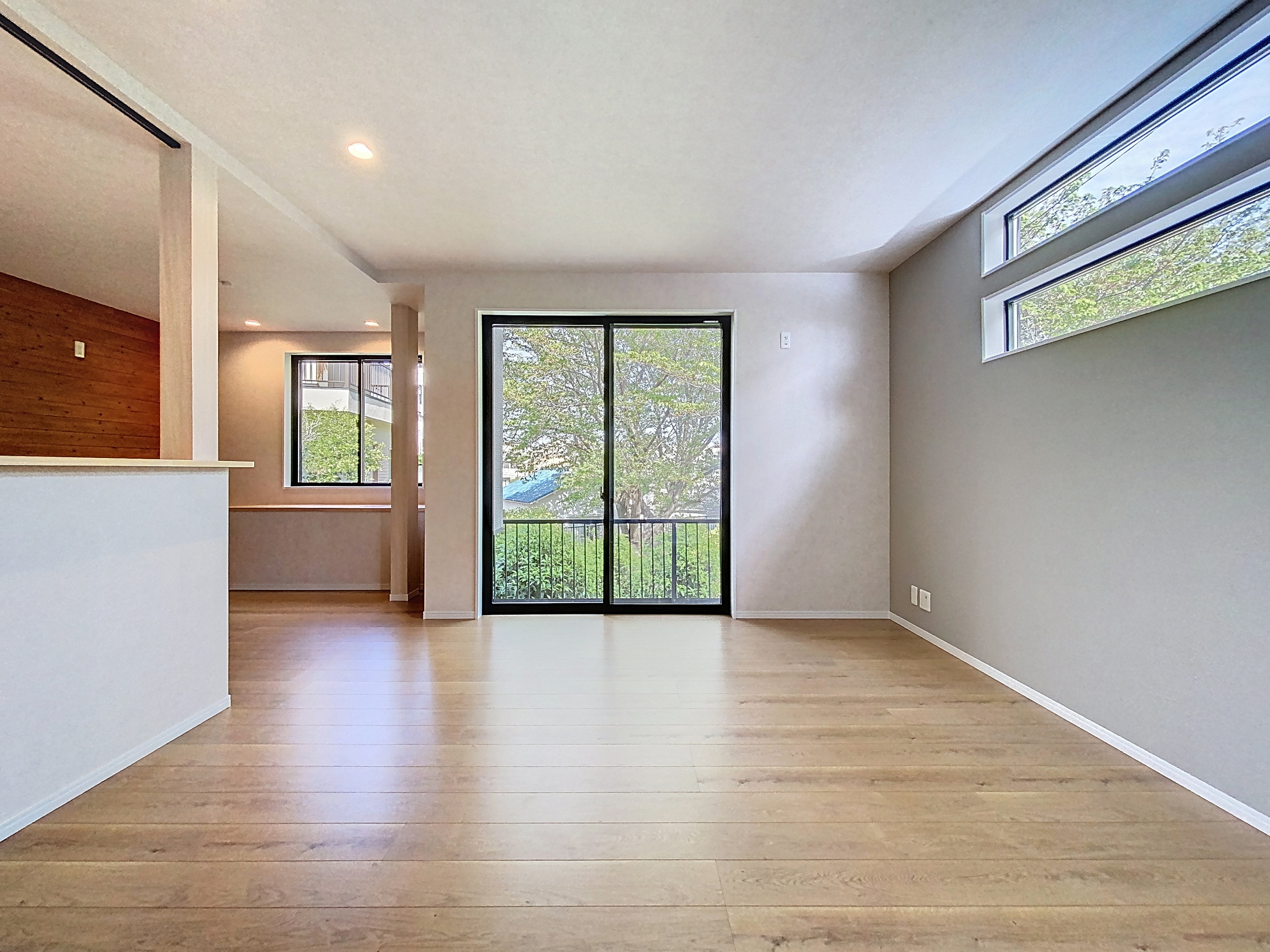 16帖を超える広々としたLDK。南向きの大きな窓は、隣接する緑地の風景を一枚の絵画のように切り取ります。四季折々の色彩がリビングに溢れ、家族の団らんを優しく彩る贅沢な特等席です。