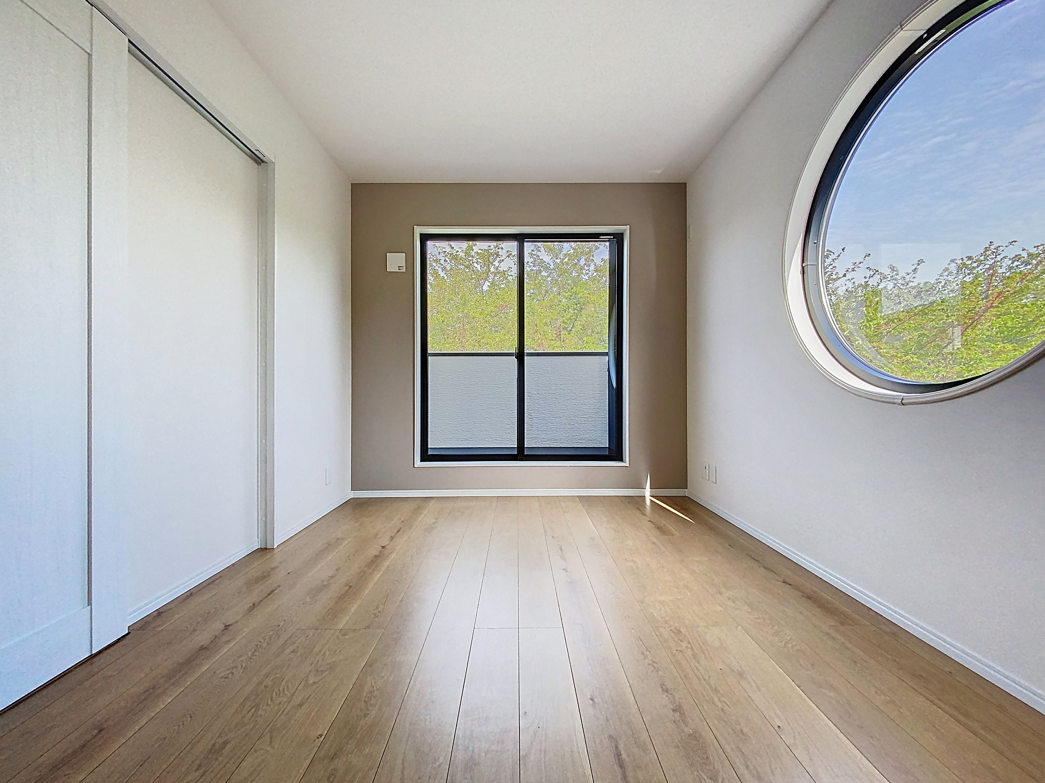 2階へと上がると、遊び心あふれる丸い窓が印象的なプライベートルームが待っています。丸く切り取られた緑の景色は、まるで森の底を覗く潜水艦のよう。家族の時間を豊かにする秘密基地です。