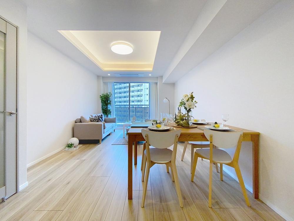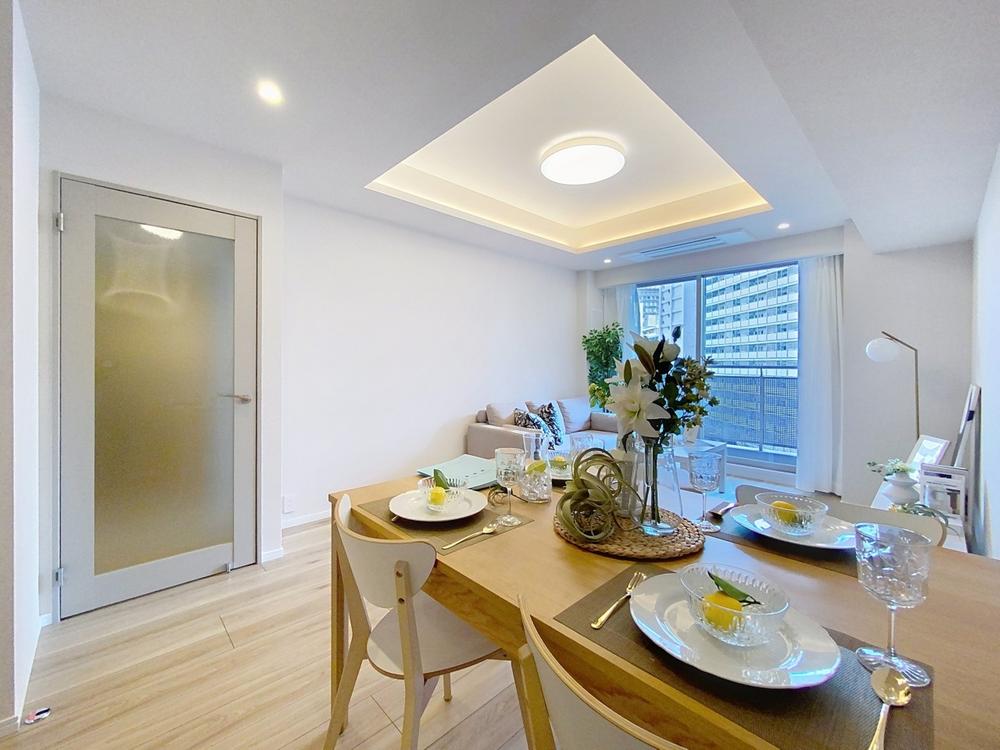 「開放的なリビングダイニング。」大きな窓辺からの日差しが暖かい室内は、自然と住まう人の気分も明るくなり、リビングでの素敵なワンシーンが演出されます。