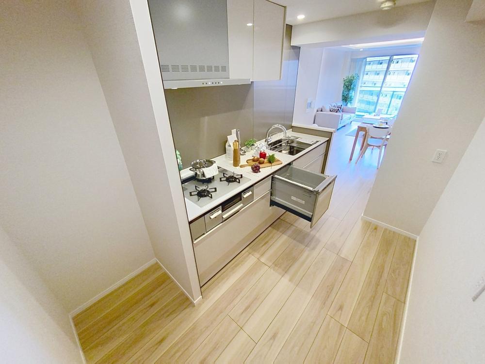 「キッチン」大型の冷蔵庫やレンジボードもしっかり置ける広々としたキッチンスペースが大事。ゆとりある空間で作業ができるとお料理の腕も日に日に上がりそうな気がしてきます。