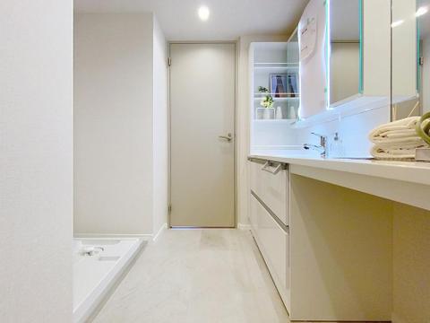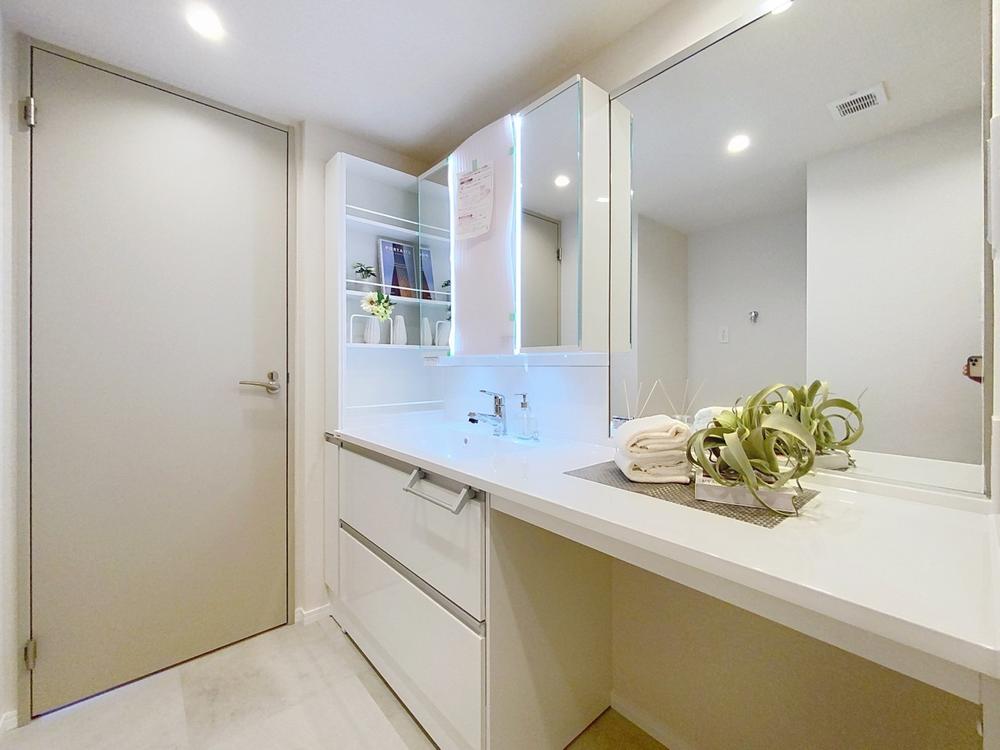 「洗面所」明るく清潔感のある色調で纏められた洗面室は、機能性に富んだ三面鏡と使い勝手の良い収納を完備した洗面台を設置しております。