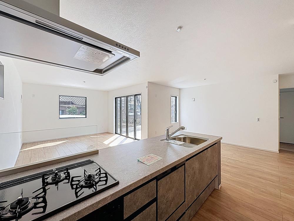 明るい自然光が入る、作業スペースを多くとったキッチン。調理がしやすく余裕の広さ。食器類もすっきりと片付く収納力です。家事をしながら会話も弾みます。