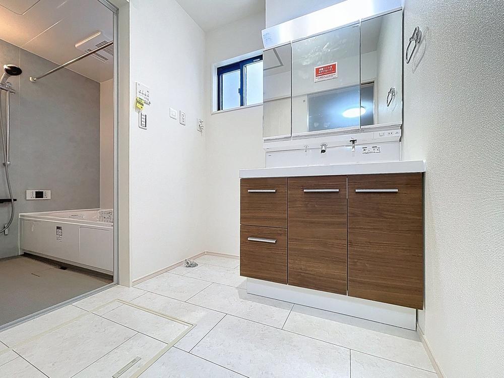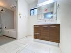 「清潔な印象の洗面室」明るく清潔感のある色調で纏められた洗面室は、機能性に富んだ三面鏡と使い勝手の良い収納を完備した洗面台を設置。洗濯機置場も完備し、大変充実しております。